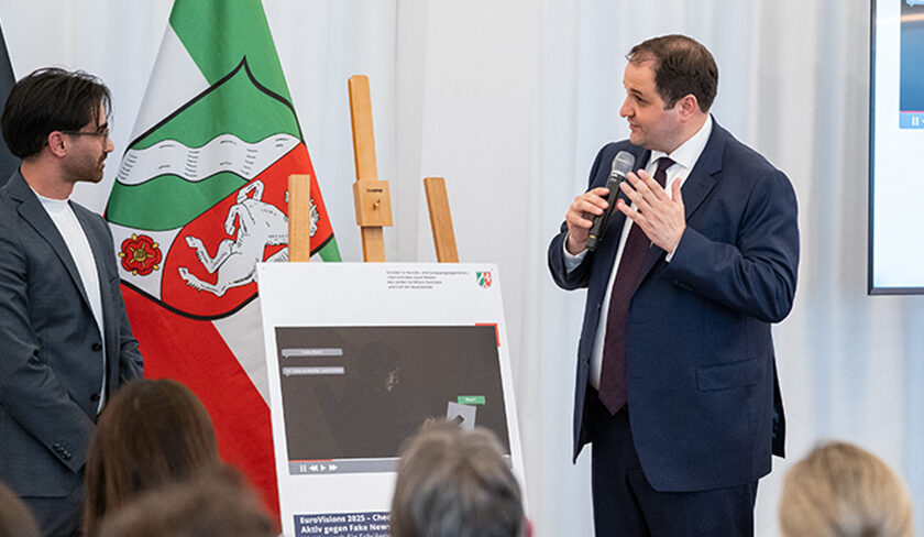 Mit seinem Kurzfilm „Schlechte Nachrichten“ hat Saber Ansari, Schüler der Klasse 13 der Gestaltungstechnischen Assistenten mit FHR am Richard-Riemerschmid-Berufskolleg Köln, einen besonderen Erfolg erzielt: Sein Beitrag wurde beim Schülerfoto- und Kurzfilmwettbewerb „EuroVisions 2025“ als Bester Kurzfilm der Sekundarstufe II ausgezeichnet. Mit der Auszeichnung ist zudem ein Preisgeld in Höhe von 750 Euro verbunden. Bei der Preisverleihung in der Staatskanzlei in Düsseldorf wurde Sabers Arbeit zudem in einer besonderen Laudatio von Nathanael Liminski, Minister für Bundes- und Europaangelegenheiten, Internationales sowie Medien des Landes Nordrhein-Westfalen und Chef der Staatskanzlei, hervorgehoben. Diese Würdigung unterstreicht nicht nur die filmische Qualität seines Beitrags, sondern auch die Relevanz des Themas, mit dem sich Saber auseinandergesetzt hat. Unter dem Motto „Checkst Du?! Aktiv gegen Fake News in Europa“ setzt sein Film ein starkes Zeichen gegen Desinformation und für einen bewussten, kritischen Umgang mit Informationen. Besonders hervorzuheben ist dabei auch die Perspektive Geflüchteter in Deutschland, die Sabers Film zusätzliche Tiefe verleiht. Saber kam …