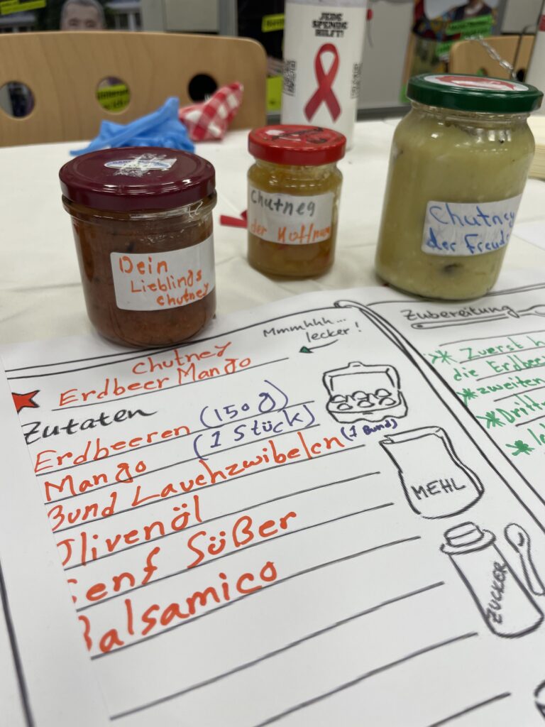 Die Schüler*innen hatten sehr kreative Ideen, so gab es z.B. ein Kartoffel-Chutney mit Mandeln und Rosinen oder ein Erdbeer-Mango-Chutney.