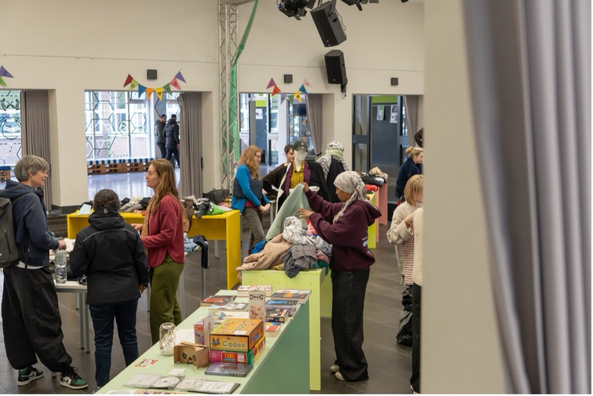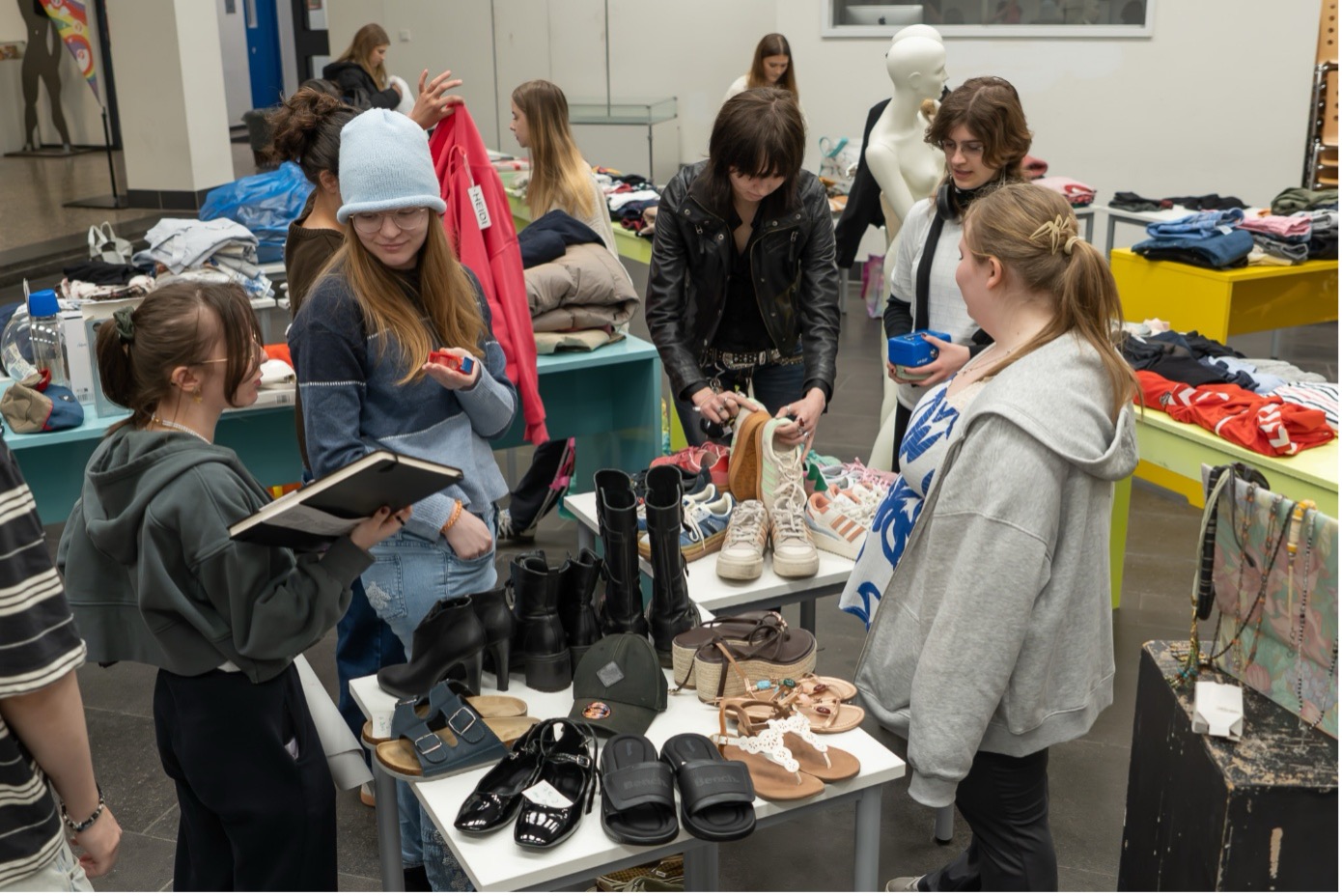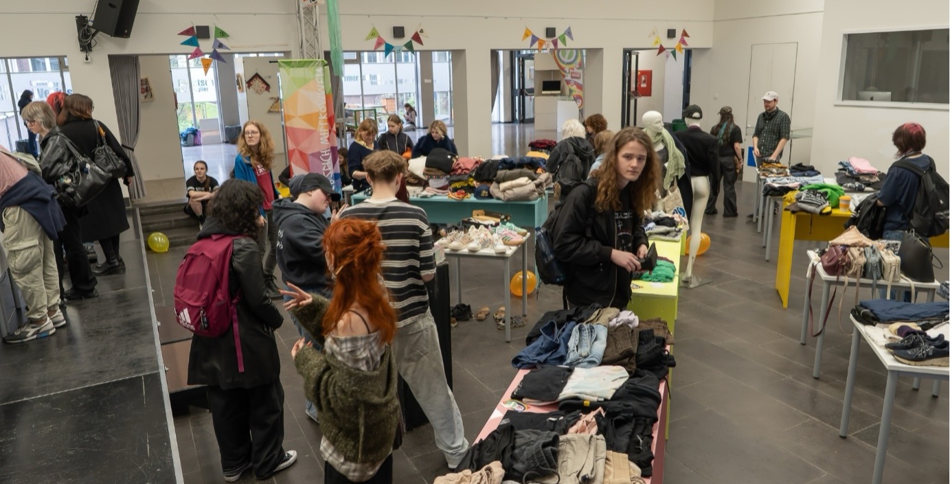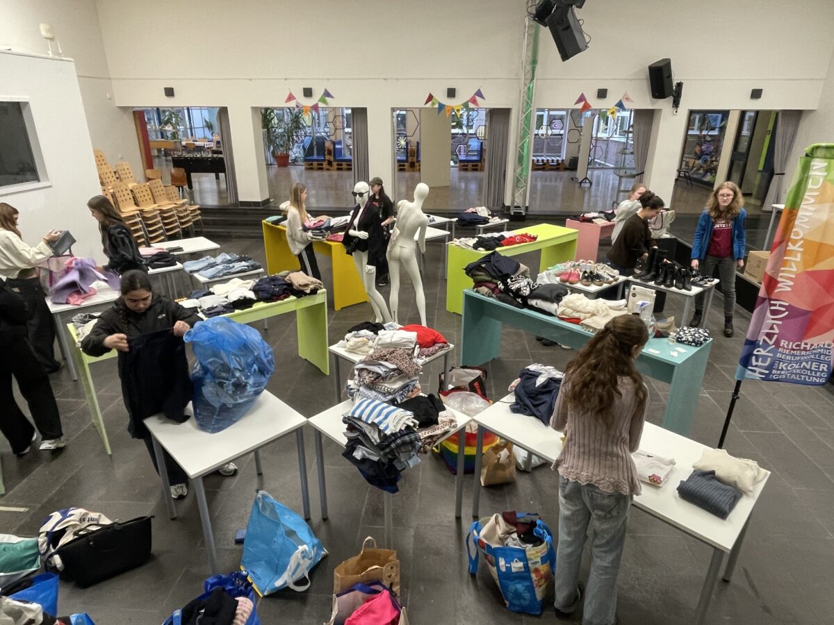 Am Tag des Flohmarkts war die Klassen entsprechend nervös – hatten wir genug Spenden gesammelt? Würde es genug Schülerinnen, Schüler und Lehrkräfte geben, die etwas kaufen wollten und die Preise gut fanden? Würde die G11-1 „genug“ verkaufen? Kaum begann die erste Pause, kamen die ersten Besucher/innen und der Trubel ging los! Es wurde gesucht, anprobiert, nachgefragt, diskutiert und verkauft. Die Zeit verging schnell und ganz plötzlich war schon wieder 13:30 Uhr und Zeit zum Aufräumen! Viele Artikel hatten neue Besitzer/innen gefunden, denn die Klasse hatte deutlich weniger am Ende des Tages zum wiederzusammenpacken. Auch in den Einnahmen spiegelte sich das ein paar Tage später wider – denn insgesamt hatte die G11-1 fast genauso viel Geld eingenommen wie in dem Jahr zuvor – und dieses Jahr waren deutlich weniger Klassen an dem Tag in der Schule gewesen! Das zeigte allen in der Klasse ein weiteres wichtiges Ziel hinter der Veranstaltung: Die Idee, dass die Schule sich als Gemeinschaft versteht, sich gegenseitig hilft und voneinander auch profitieren kann, indem man Kleidung und andere Dinge miteinander austauscht oder weiterverkauft, um durch den so wieder eine andere Person in der Schule zu unterstützen. Wie auch im letzten Jahr werden die Einnahmen dem Förderverein des RRBKs gespendet.